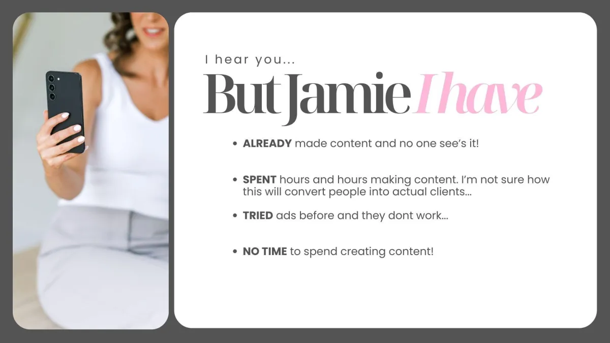 So you don’t have time to be a “content creator”? I get it... But let me ask you a tough question: Can you afford not to be? Let’s be honest—you’re here because you want to grow your business. And social media marketing, when done right, is one of the most leverageable tools to make that happen. When you focus on creating the right content and pair it with strategic ads to get it in front of the right audience, the time investment pays off. Learning how to maximize and leverage every piece of content —doubling and even tripling its impact—makes the process efficient and saves you time in the long run. Are you ready to make your content work harder for you?